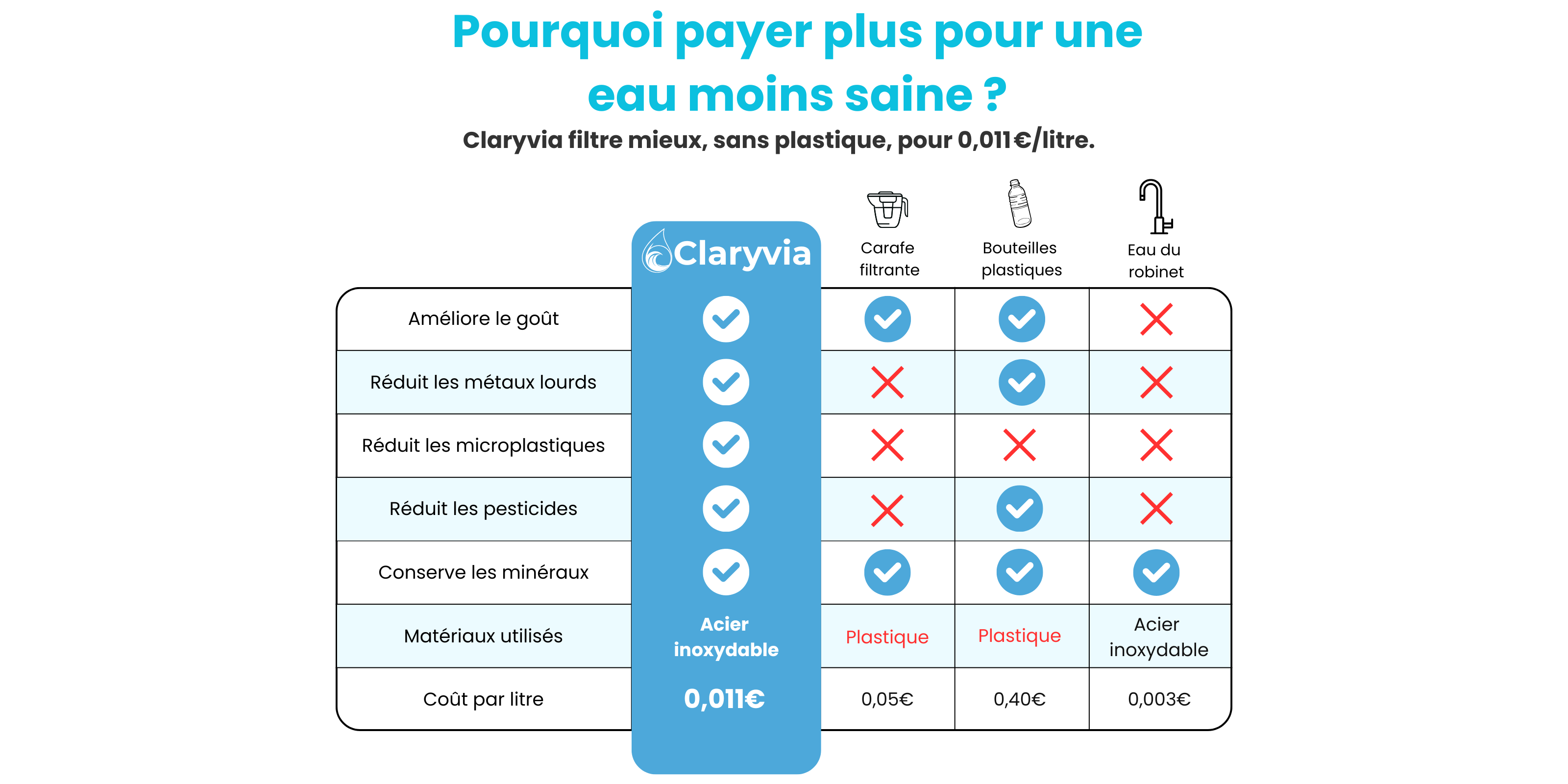 👉 Opter pour un filtre Claryvia®, c’est choisir une solution saine, économique, et zéro plastique à usage unique.